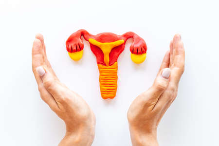 Holding an uterus organ with ovaries in the hands, female reproductive system, pregnancy and gynecological concept, diseases like cancer and polycystic