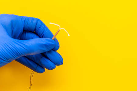 Doctor gynecologist holding intrauterine contraceptive device. T-shaped copper contraceptive