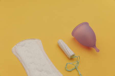Pad, menstrual cup and tampon on a yelliw background. Concept of womens healthcare and hygiene