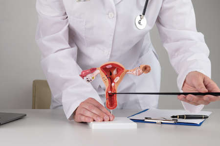 doctor gynecologist pointing model of female reproductive system on his desktop