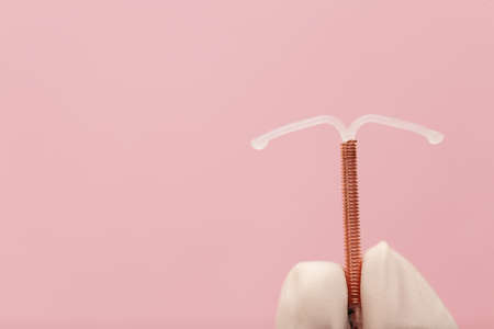 Doctor holding T-shaped intrauterine birth control device on pink background, closeup
