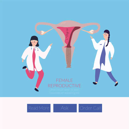Two female doctors talk about a woman's reproductive system. Website page. Medicine, women's health concept.