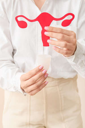 Woman holding model of female reproductive system on light brown background, top view. Space for text