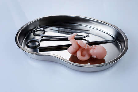Doctor surgeon holds a surgical scalpel against the background of the layout of the female reproductive system. Concept of vaginal plastics, abortion, surgical operations to remove polyps and cystoscopy in women, hysteroscopy