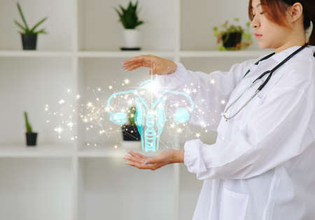 asian female doctor wear white coat and face mask explaining uterus model to woman in hospital