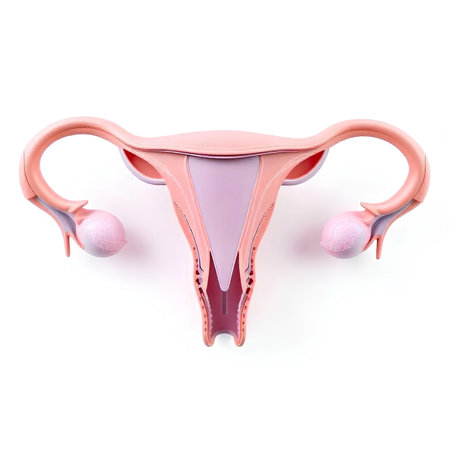 A detailed, realistic anatomical model of the female reproductive system, including the uterus, fallopian tubes, and ovaries, against a neutral background.