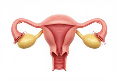 A detailed anatomical illustration of the human female reproductive system, including the uterus, fallopian tubes, and ovaries, presented isolated on a white background.