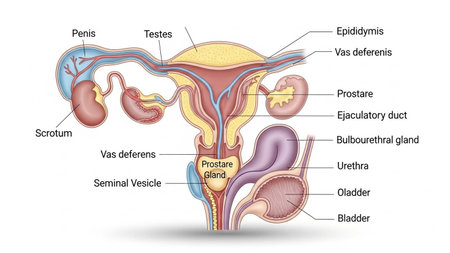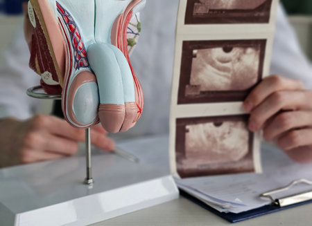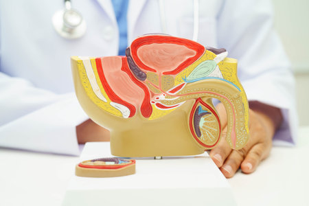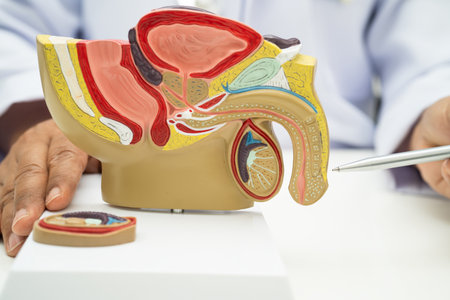 Male reproductive system, doctor holding human anatomy model for study diagnosis and treatment in hospital.