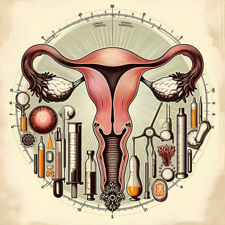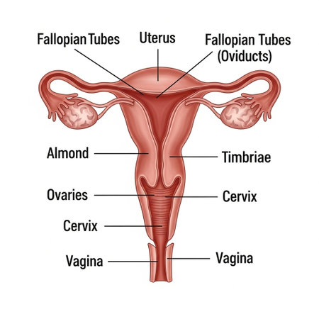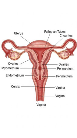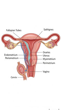 A detailed anatomical model displays the uterus, fallopian tubes, and ovaries, presented against a neutral background.