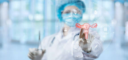 Healthy feminine concept. Doctor in a white coat checkup the uterus reproductive system, women's health, PCOS, ovary cancer treatment and examination,