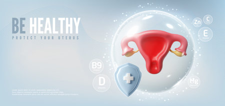 Be healthy protect your uterus 3D vector banner, female reproductive system in protective sphere with shield and cross