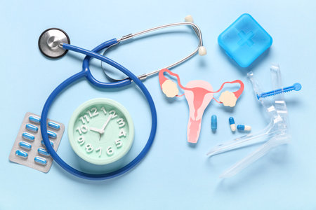 Clock with paper uterus and medical supplies on blue background. Gynecology concept