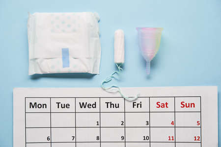 Calendar with cotton tampons and menstrual cup. Woman critical days and hygiene protection