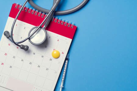 Top view of stethoscope and calendar on the blue background, schedule to check up healthy concept