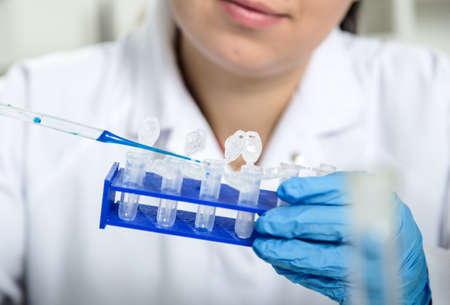 Stock photo of unrecognized scientist filling test tubes in the laboratory.