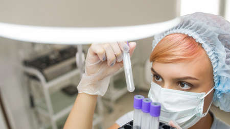 Sexy lab technician works with blood sample. Cosmetics development and testing