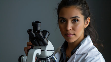 Hispanic Female Scientist in Lab Coat Holding Microscope Portrait Shot