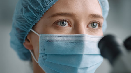 A healthcare professional wearing a blue surgical mask and cap examines samples through a microscope in a laboratory, showcasing dedication to research and precision.
