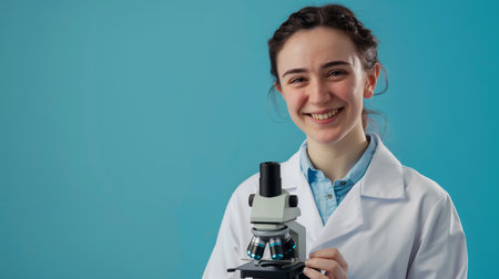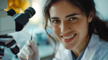 Smiling researcher with microscope in a laboratory. A happy scientist in a white coat looking at the camera, symbolizing scientific discovery and innovation.