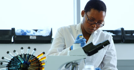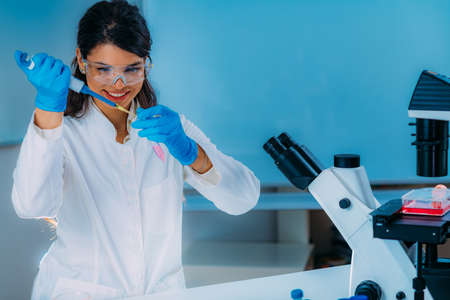 Female scientist conducting an experiment with laboratory equipment and microscope in a research lab