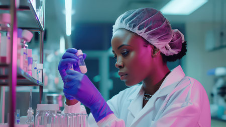 Young Black woman scientist wearing lab coat and gloves, holding a test tube with blue liquid, working in a chemistry laboratory