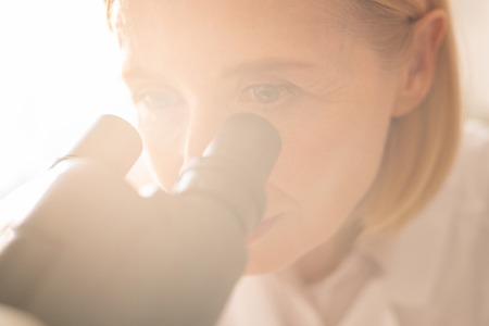 Science, medical research and woman with microscope, vaccine development and pharmaceutical study. Mature person, forensics test and scientist in lab, equipment and bio chemistry with technology