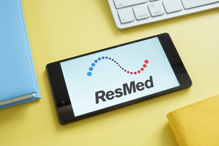 KYIV, UKRAINE - June 30, 2021. ResMed logo on the screen and tablets.
