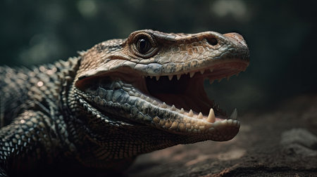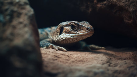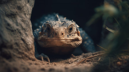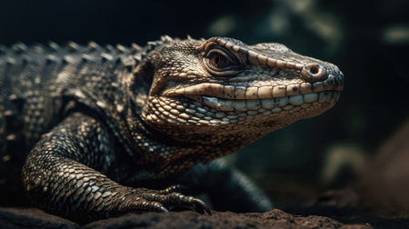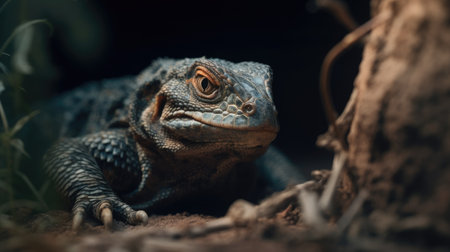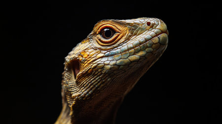 An AI generated illustration of a lizard posed against a solid black background and illuminated by a dark colored light source