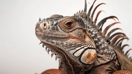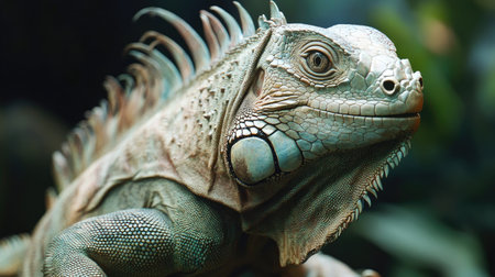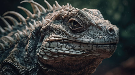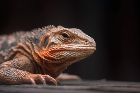 Close-up portrait of a female brown iguana, an endangered species of lizard on nature blurred background.