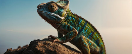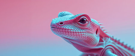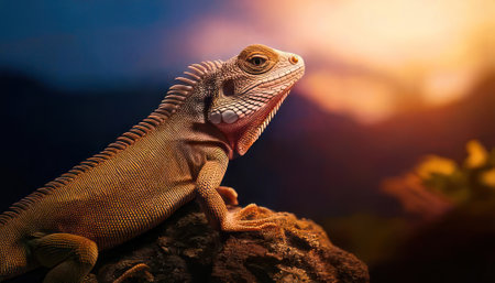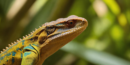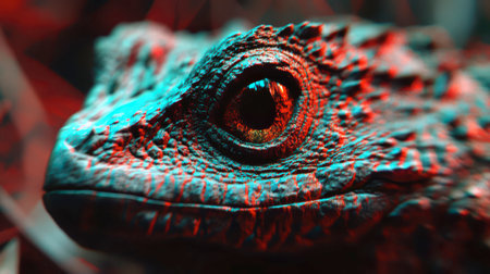 A vibrant close-up image of a reptile showcasing its colorful scales and striking eyes. The detailed texture highlights its natural beauty in a captivating pose.