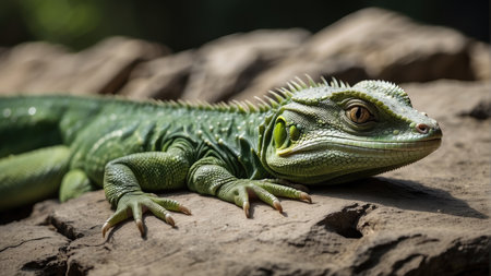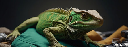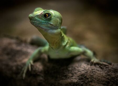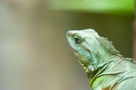 Iguana cub in close-up with green background. South American and Brazilian biodiversity.