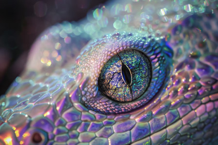 A lizard's eye is shown in a colorful, iridescent light. The eye is surrounded by a pattern of scales, and the iris is a deep blue color. Scene is one of wonder and fascination
