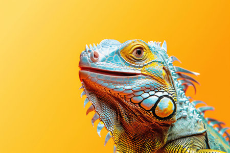 Close up of colorful green iguana against vibrant yellow background. Animal portrait wit copy space