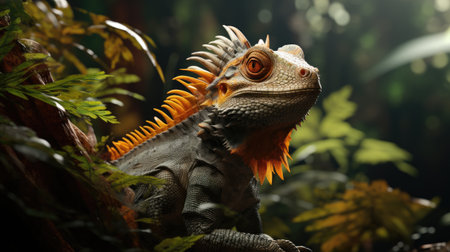 Tropical lizard in jungle on a sunny day. Rainforest illustration with bright colorful reptile among exotic plants with big leaves. Background with pristine nature landscape. Generative AI
