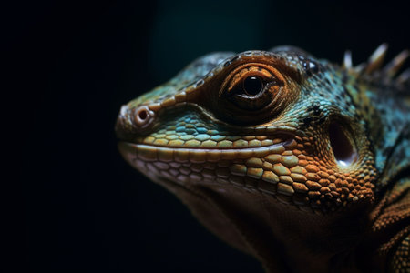 Stunning close-up of a colorful lizard showcasing intricate scales and bright eyes against a dark background, highlighting its unique features and beauty in nature.