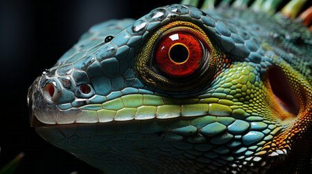 A vibrant close-up image of a reptile showcasing its colorful scales and striking eyes. The detailed texture highlights its natural beauty in a captivating pose.
