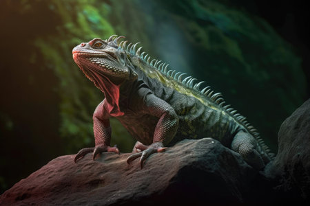 A detailed close-up of a spiky lizard perched on a rock. Surrounded by vibrant greenery, this image captures the essence of wildlife in its natural habitat.