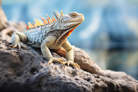 A stunning close-up shot of a lizard resting on a rock, showcasing its intricate scales and textures in a natural setting, emphasizing wildlife beauty and serenity.