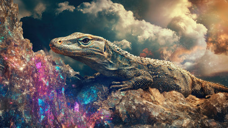 A stunning lizard rests on colorful rocks adorned with vibrant gemstones, set against a dramatic celestial backdrop filled with swirling clouds.
