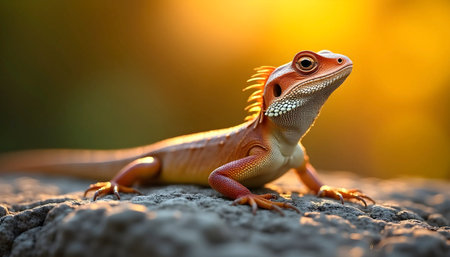 A colorful gecko perched on a rock in a forest during the golden hour, showcasing intricate patterns and textures