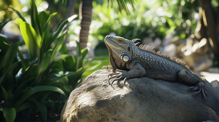 A vibrant lizard rests comfortably on a textured rock, surrounded by natural greenery. The soft sunlight highlights its intricate scales and colors, showcasing the beauty of wildlife in its habitat.