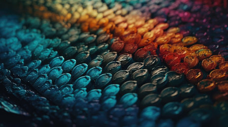 Stunning closeup macrophotography of vibrant iridescent scales with intricate patterns and shimmering textures in natural rainbow colors. Showcasing the beautiful. Bright