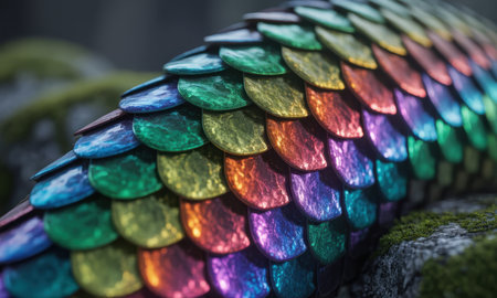 Close up of vibrant, iridescent scales on a fantasy creature, displaying a spectrum of rainbow colors with a metallic sheen and intricate texture.