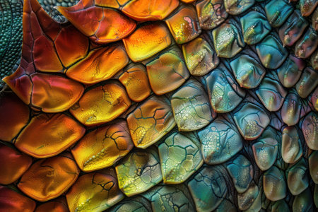 A mesmerizing macro view reveals the intricate, jewel-like armor of a reptile. Each scale shimmers with an iridescent blend of gold, green, and orange, creating a vibrant, abstract pattern that speaks to the beauty and complexity of natures design.