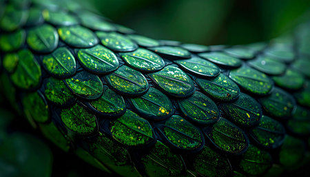 A mesmerizing macro photograph capturing the intricate, jewel-like pattern of a green snakes scales. The deep emerald and forest green tones, highlighted with a subtle sheen, create a sense of wild, untamed nature and mysterious beauty found deep within the jungle.
