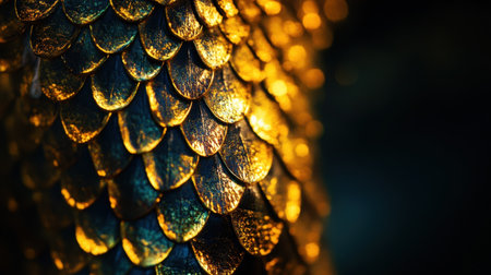 A stunning close-up of a snake's golden scales, artfully illuminated against a dark background, celebrating transformation and Lunar New Year themes