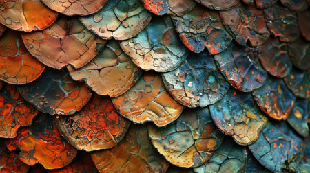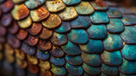 Explore the stunning details of vibrant iridescent scales in this macro photograph, showcasing rich colors and intricate textures of nature.