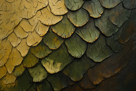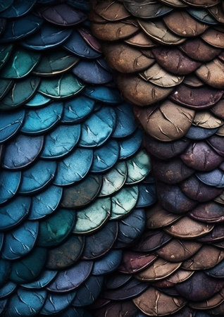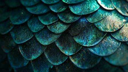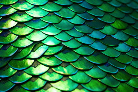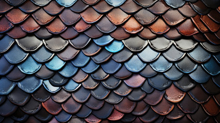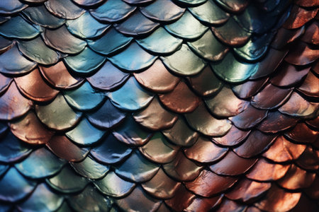 Abstract art of dragon skin in seamless iridescent fantasy scales pattern design. Closeup intricate hyper realistic beautiful animal skin. Finest generative AI.