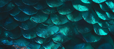 This stunning close-up image captures the intricate textures and vibrant colors of fish scales, showcasing a blend of blue and gold hues. The iridescent qualities reflect light beautifully, highlighting the natural detail and artistic design of aquatic life. Ideal for nature and wildlife themes.
