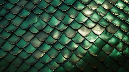 Emerald green metal texture of dragon scales, with a reflective, shimmering surface. The intricate scales catch the light in a dazzling pattern, ideal for mythical creatures and fantasy-inspired visuals.
